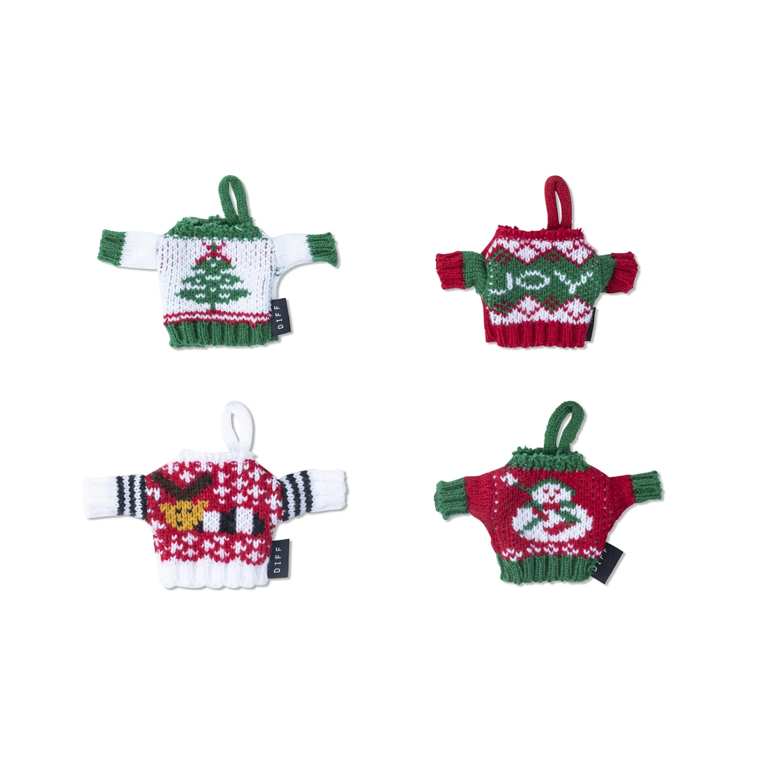 Give your tree some personality with DIFF’s Christmas Sweater Ornament Bundle, featuring four different ugly christmas sweaters.